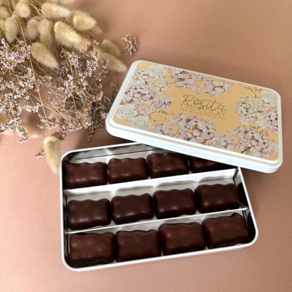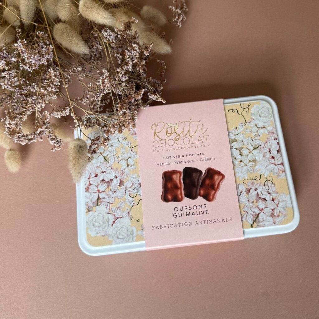 Une jolie boîte métal garnie de 12 oursons guimauve avec 3 saveurs différentes pour plus de gourmandise ! Confectionnés dans notre manufacture avec des gousses de vanille, de la purée de fruit framboise ou passion puis enrobés avec notre chocolat bean to bar.